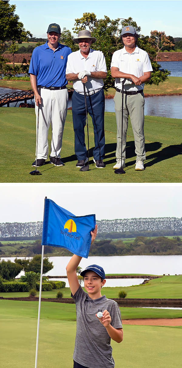 Flavio Maschietto, Toninho Abdalla e Thomas Liu (no alto) e Lorenzo comemorando o hole-in-one