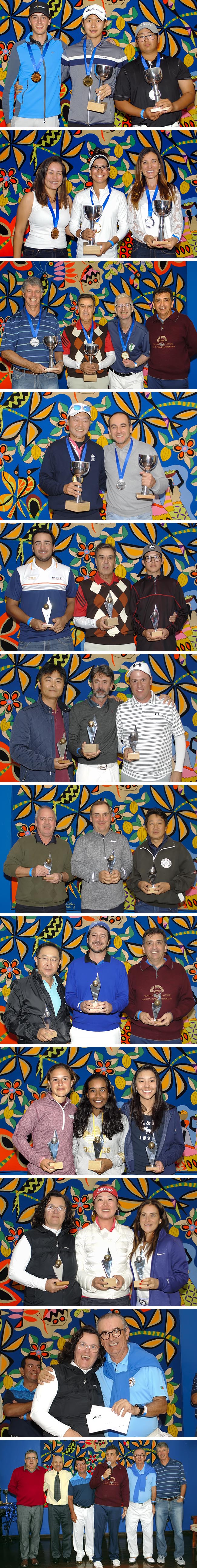 Ao lado, Antônio Padula, presidente da FPG, com os campeões Jinbo Há e Lauren Grinberg. Abaixo, em ordem descendente, os pódios scratch, masculino e feminino, sênior, pré-sênior, das categorias masculinas com handicap até 8,5, de 8,6 a 14, de 14,1 a 19,4, de 19,5 a 25,7 e as femininas até 16 e de 16,1 a 25,7; a entrega do sorteio Golf Travel e a mesa de premiação.