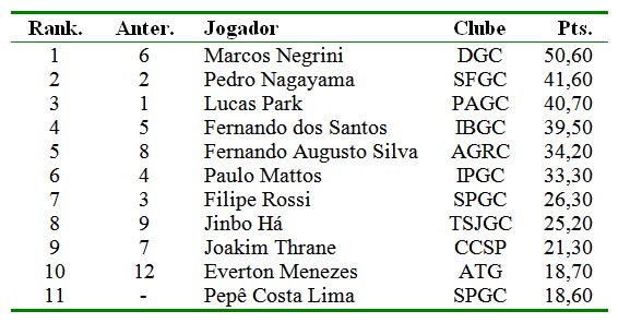Já Lucas Park, do Paradise, o líder anterior do ranking, que terminou em quarto lugar em Campinas, uma tacada atrás de Negrini, caiu para o terceiro lugar do ranking, atrás de Pedro Nagayama, do São Fernando, que se manteve em segundo. Em quarto lugar, vem Fernando Vieira dos Santos, de Ibiúna, seguido por Fernando Augusto Silva, da Academia GolfRange Campinas que continuando sua rápida ascensão, saltou do oitavo para o quinto lugar.