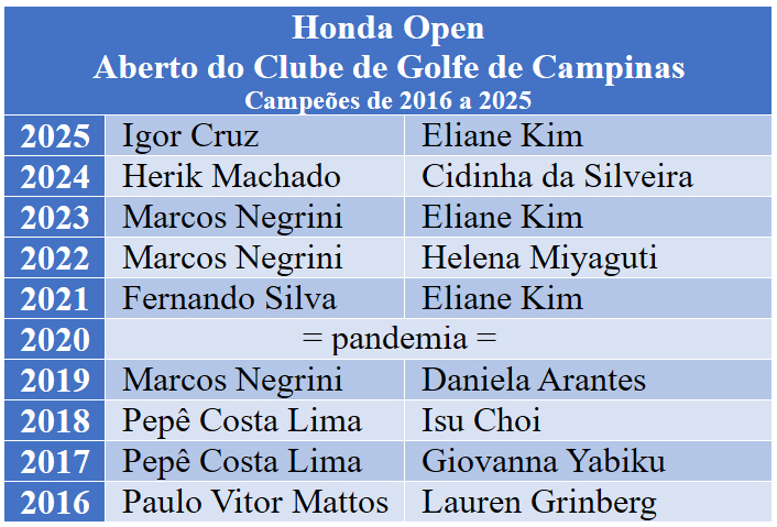 O Honda Open – Aberto do Clube de Golfe de Campinas – 61º Masculino e 42º Feminino, tem patrocínio master da Honda e patrocínios de Tunibra; Visafran Soluções; Buraco 19; Restaurante Sumirê; Lahuman; Campinas Kai; Unimed Campinas; Benicar; LSL; Posto Madeira; Cinetica Academia; Ukin; Abadia Empreendimentos Imobiliários; Auten Incorporadora; Move Me – Sofisticação em Movimento; e Supermercados Pague Menos. A organização é do Clube de Golfe de Campinas e da Federação Paulista de Golfe.