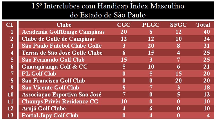 Líder desde a primeira rodada, a Academia GolfRange Campinas (AGRC) disputa nesta quarta-feira, 31 de maio, no Arujá Golf Club, a quarta rodada do 15º Interclubes com Handicap Índex Masculino do Estado de São Paulo disposta a manter sua vantagem sobre os outros 12 times que participam desta que é a maior competição de golfe do país, tanto em duração como em número de jogadores envolvidos. O Interclubes é organizado pela Federação Paulista de Golfe (FPG).