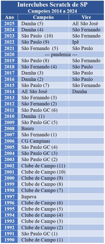 A equipe do Damha Golf Club, de São Carlos, confirmou seu favoritismo ao derrotar neste domingo, 14 de dezembro, o time da Associação Esportiva São José, no jogo de volta da final, em sua casa, por 4,5 a 0,5, e ser campeã do 35º Interclubes Scratch Masculino do Estado de São Paulo com um agregado de 7,5 a 2,5 pontos. No jogo de ida, em São José dos Campos, na semana anterior, o time da casa quase surpreendeu o Damha ao vencer dois jogos com facilidade e só perder os três restantes no buraco 18. Pelo segundo ano consecutivo, o Damha venceu todos os confrontos de ida e volta para chegar ao título.