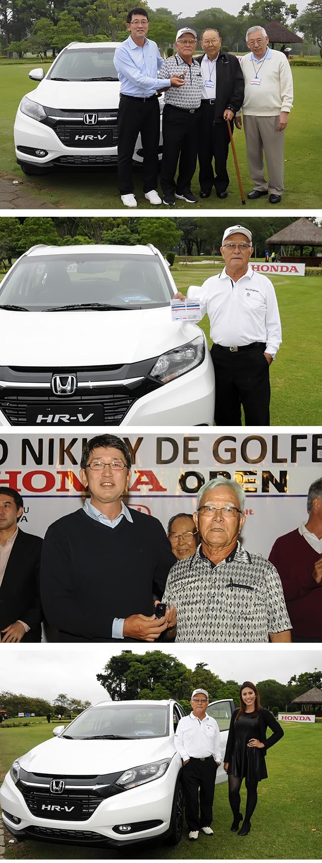 Uesugi em quagtro momentos: recebendo as chaves do carro no campo, com Otávio Mizikami, da Honda, Muneki Tikasawa e Roberto Yoshihiro Nishio, presidente e vice do Nikkey; com o carro e o cartão de jogo; na entrega oficial, na premiação; e com o carro e a promotora da Honda
