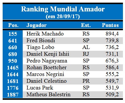 O carioca Daniel Kenji Ishii ainda é o segundo melhor brasileiro que mora no país do ranking mundial, em quarto lugar, seguido pelo paulista Pedro Nagayama, do São Fernando. Entre os brasileiros Top 10 do ranking mundial amador, há quatro paulistas, três gaúchos, um alagoano, um carioca e um paranaense.