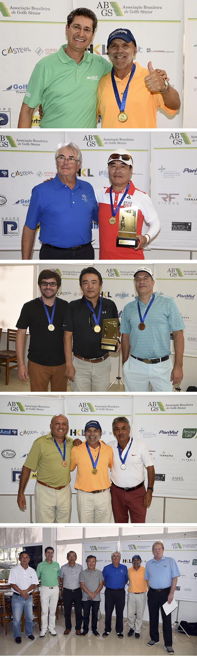 Ao lado, o pódio sênior scratch com Iijima, Ahn e Karasawa, ganhadores de medalhas e bronze, ouro e prata, respectivamente. Abaixo, em ordem decrescente, Ademir Mazon, VP da FPGolfe, entrega a medalha de ouro a Luiz Martins, campeão profissional; Claudio Kyrila, da ABGS, premia o campeão sênior Lyn Ahn; os pódios pr-e-sênior e profissional e os integrantes da mesa. No final, todos os premiados comemoram